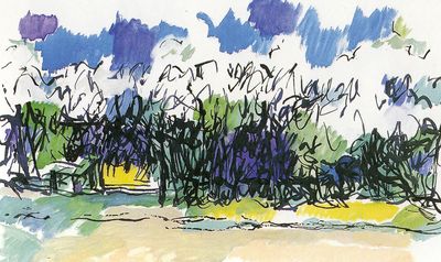 Comme elle commence humblement, cette troisième étape ! Vassart oublie les toiles, les couleurs éclatantes, il revient au noir et blanc, à l'encre de chine et au papier. Ce ne sont que des hachures d'abord, jetées en fouillis à partir de l'observation des herbes hautes, des buissons. Il semble que le peintre réapprend à écrire. Il est sorti de la douceur des sphères dont la très grande beauté immobile menaçait la vie même. Il réapprend à écrire, non pas les mots, mais les formes de la nature. Le format qu'il choisit, ces longues bandes horizontales de papier, rappelle le support du mouvement même de l'écriture. Vassart sortait du silence plastique pour renouer avec la quête du chemin, de l'issue. Et cette issue apparut comme d'elle-même au centre du dessin: ce sont les ouvertures qu'on devine d'abord, puis qu'on voit de plus en plus nettement, parmi l'embroussaillement du graphisme. Daniel disait qu'il ne faisait que copier l'entrée du jardin qu'on voit, parmi la verdure de la cour, depuis sa maison.