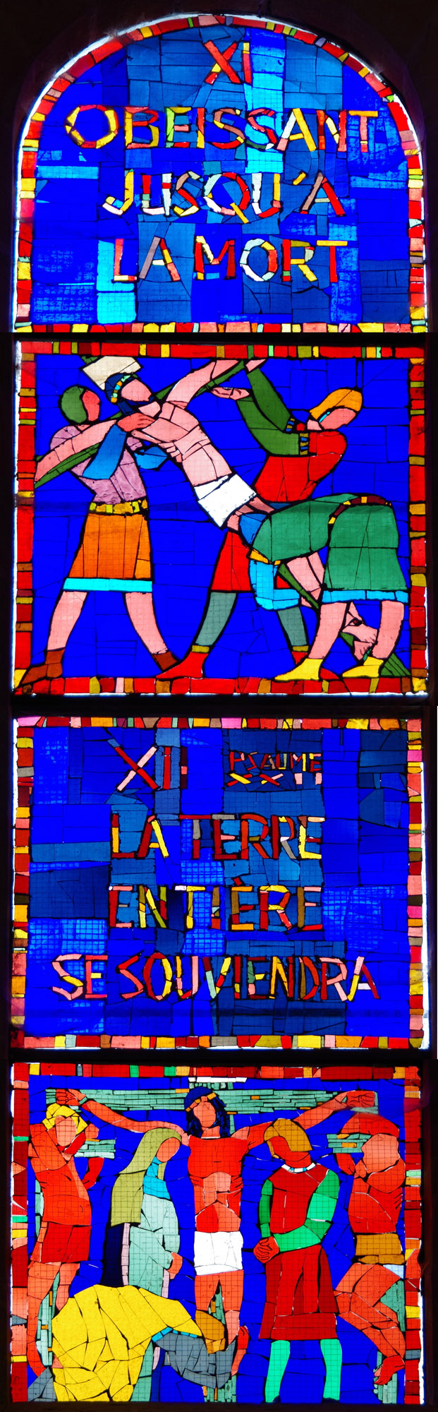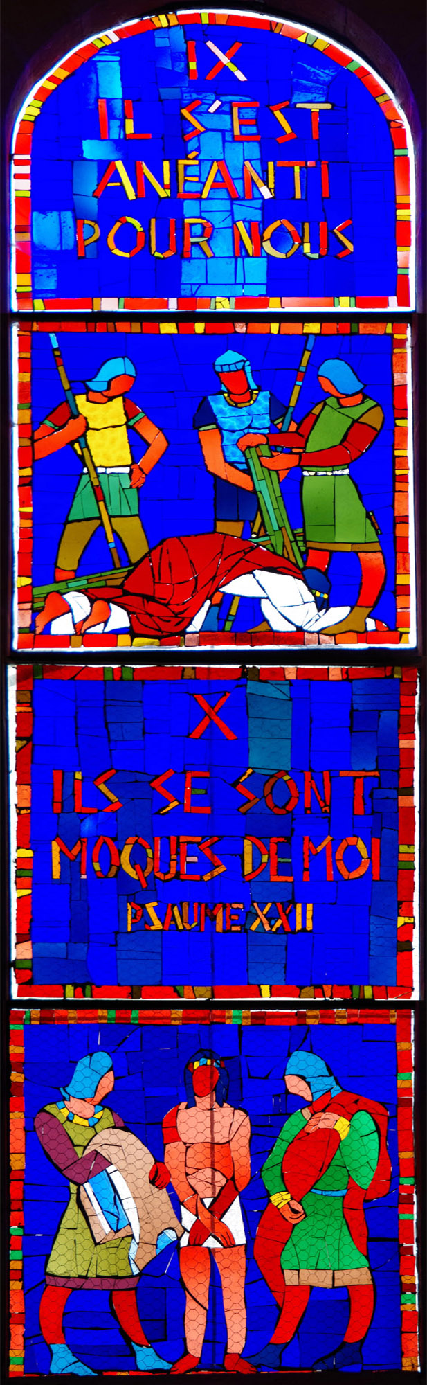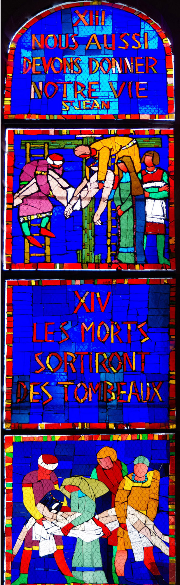 Le thème des vitraux est bien sûr religieux. Ils représentent en partie les stations du chemin de croix, entrecoupées de passages de la Bible et même d'une ligne du psaume. Les personnages rappellent ceux du Moyen Âge.
