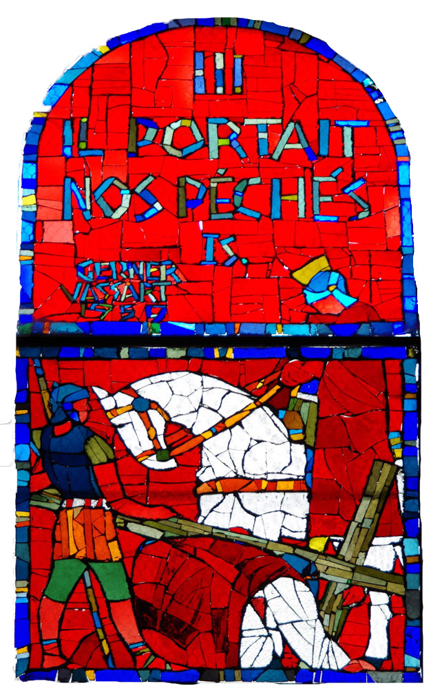 D. Vassart s’est inspiré des artistes impressionnistes tels que Cézanne, Gauguin, Van Gogh ou Matisse, en réalisant des œuvres entre la figuration et l’abstraction. Les vitraux de la chapelle illustrent parfaitement cette évolution artistique et ses influences. Les scènes des baies de la nef illustrent les étapes du chemin de croix ; quant aux baies du clocher, elles dévoilent un Christ en croix accompagné de la Vierge et de saint Jean.