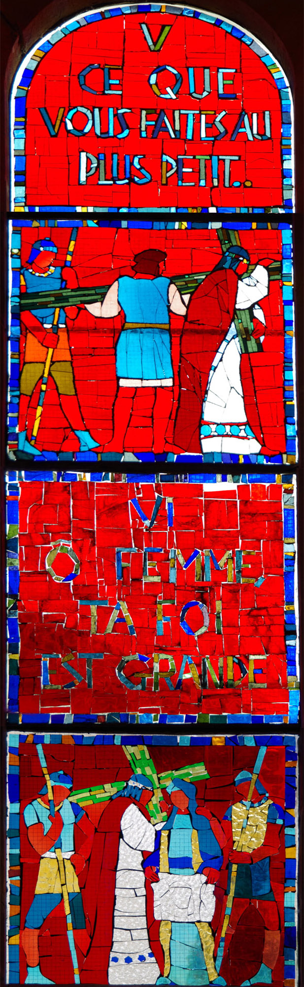 Le thème des vitraux est bien sûr religieux. Ils représentent en partie les stations du chemin de croix, entrecoupées de passages de la Bible et même d'une ligne du psaume. Les personnages rappellent ceux du Moyen Âge.